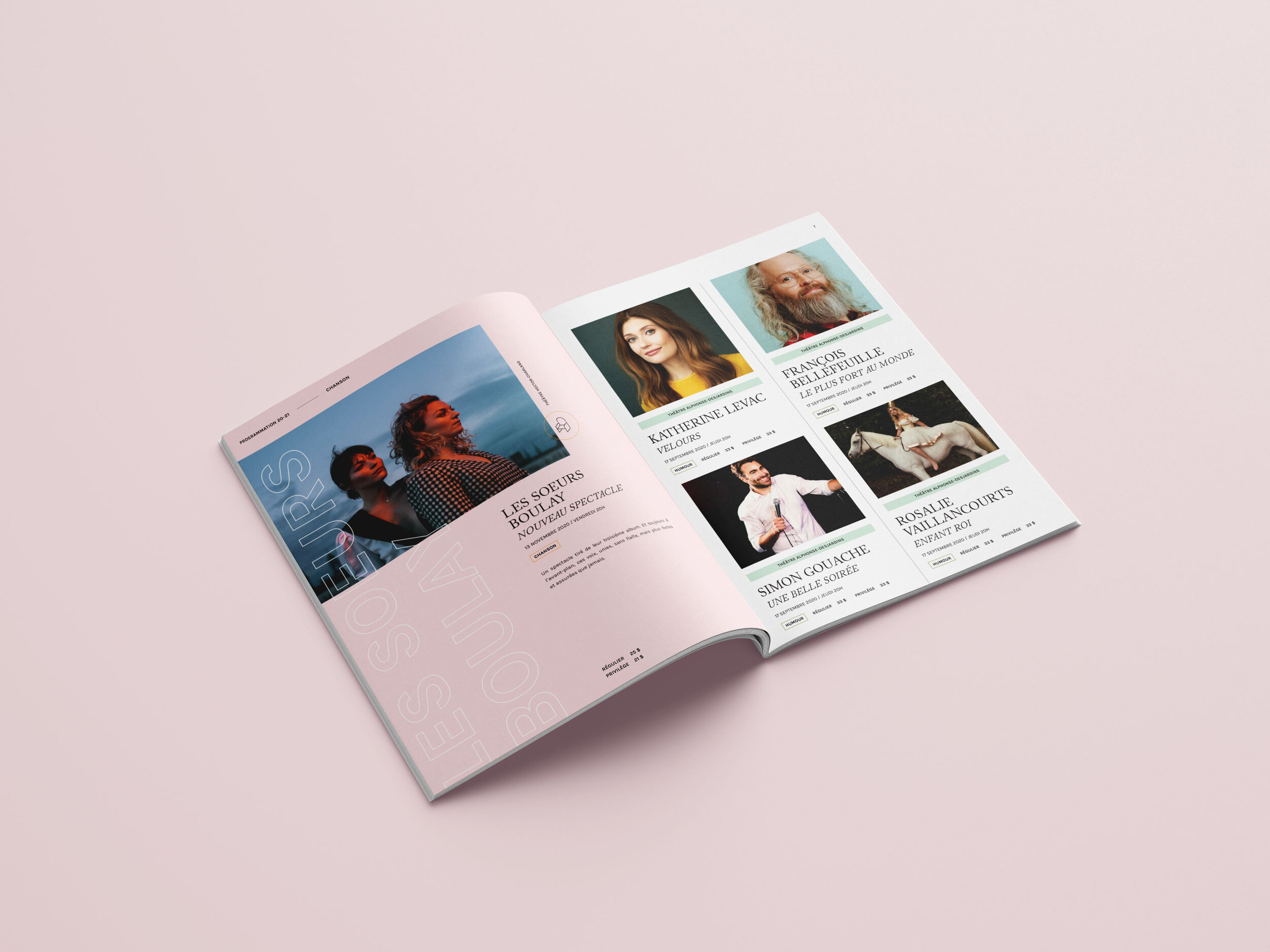Mandat: Concevoir la mise en page de la programmation imprimée des théâtres Hector-Charland et Alphonse-Desjardins dans une même brochure, basée sur la direction artistique du site web (Akufen).